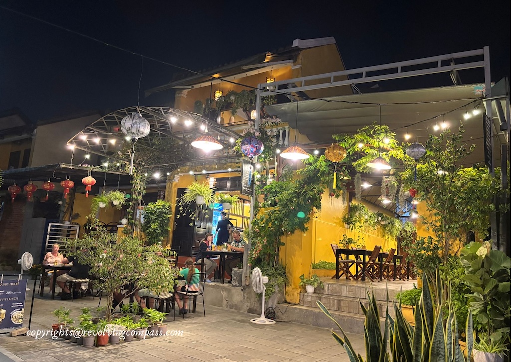 As we walked towards the famous Japanese Bridge across the Thu Bon river, we crossed through the Hoi An night market. Wherein tiny stalls loaded with numerous souvenirs and handmade items welcomed tourists. After doing a little bit of souvenir shopping, we crossed the bridge. And arrived at the other side of the town. Wherein we had lunch at one of the most famous vegetarian restaurants of Hoi An. The restaurant has an open air sitting on the first floor overlooking the whole lit-up street underneath and all across the river.