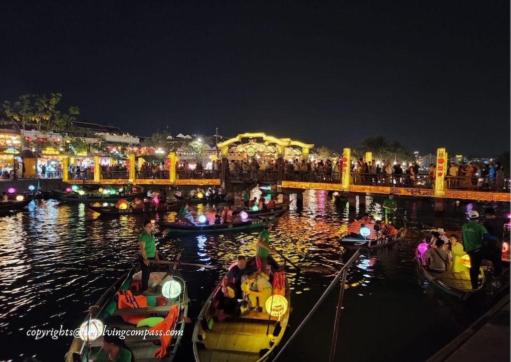 By the time we reached the banks of the famous Thu Bon river in Hoi An, it was dark. But it was not dark at all!! As the whole area on both sides of the river was litup with countless colorful lanterns. And so were the boats on the river, ready to take the visitors for the most romantic ride of their lifetime.