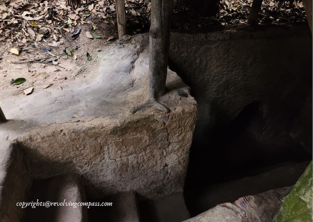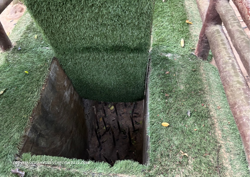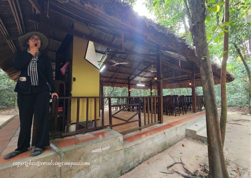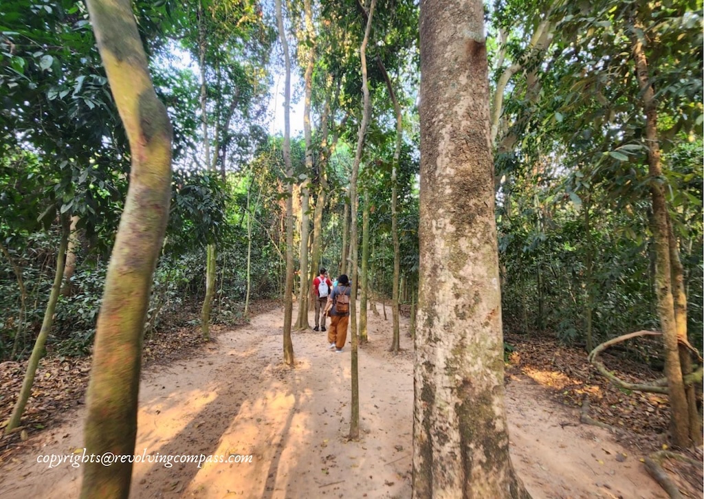 You get free guides inside the Cu Chi Tunnel campus assigned to you, to guide you through the maze of tunnels. As we entered inside, there were several tour groups around, walking ahead on the pathway to the tunnels. We followed them. And soon reached an ampitheatre where movie about the Vietnam war and the history of Cu Chi Tunnel was being displayed. Although, we decided to skip it. As it was already around 4:00pm. So, we requested the lady at the ampitheater to rather help us explore the tunnel. She called for a guide who took us to the tunnel.